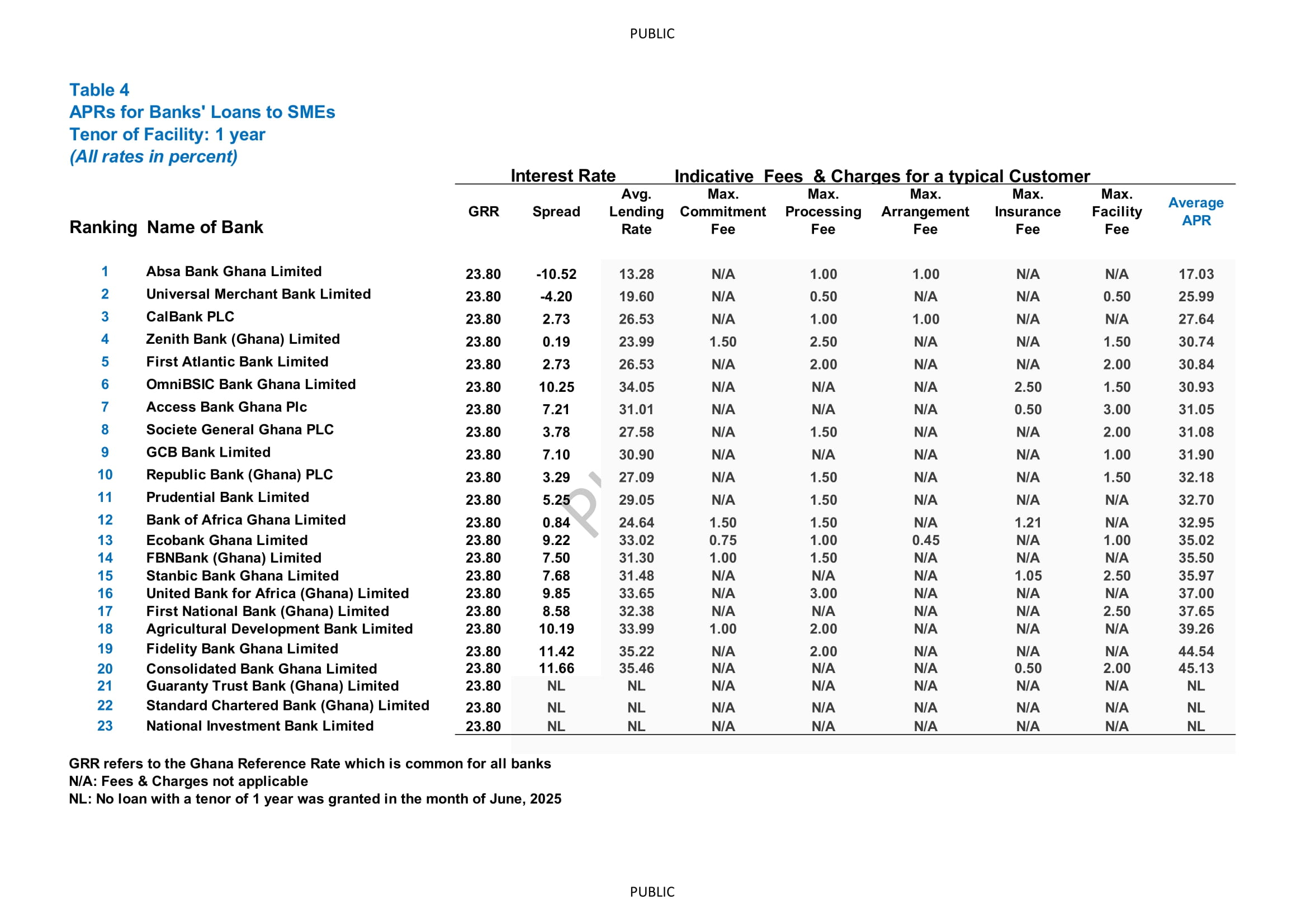 The APR represents the total cost of borrowing, incorporating the Ghana Reference Rate, institution-specific risk premia and ancillary fees.