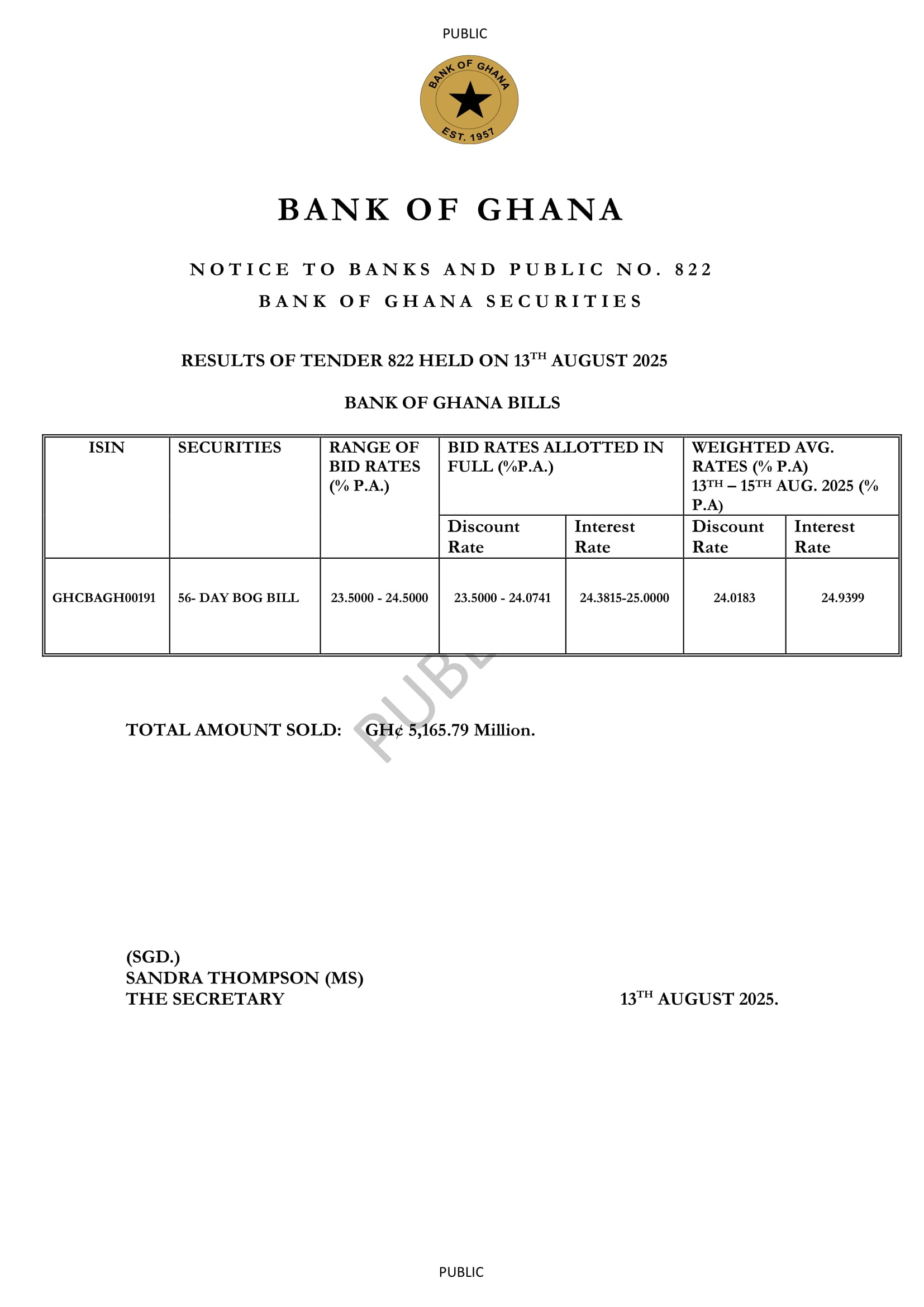 The bills, auctioned on August 13 at an interest rate of 24.9 per cent, form part of the BoG’s short-term securities programme aimed at regulating money supply and influencing market rates. The auction results did not disclose the level of bids received or the issuance target.