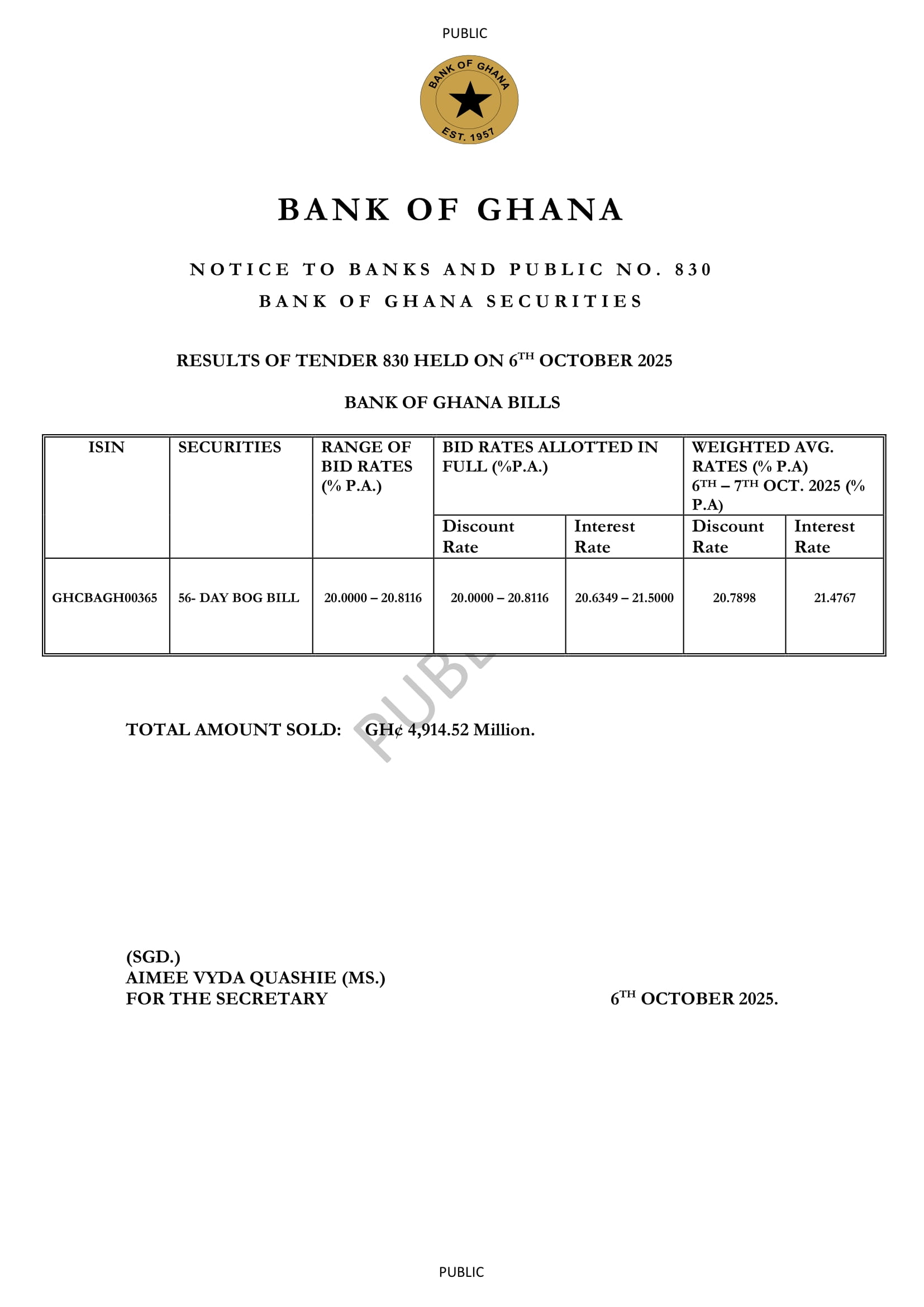 The Bank of Ghana (BoG) raised GH¢4.91 billion from the sale of its 56-day bills on October 6, 2025, as the central bank continued efforts to manage short-term liquidity in the financial system.