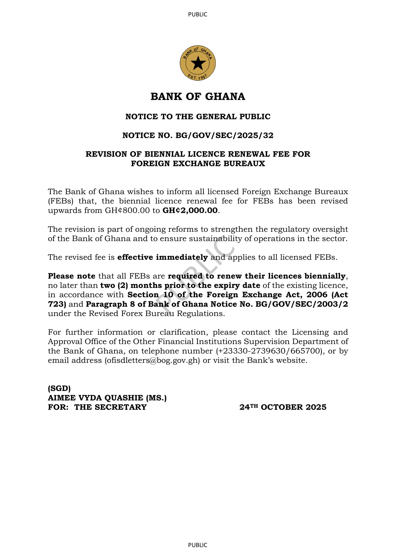 The Bank of Ghana (BoG) has announced an upward revision of the biennial licence renewal fee for Foreign Exchange Bureaux (FEBs) from GHS 800 to GHS 2,000, representing a 150 percent increase.