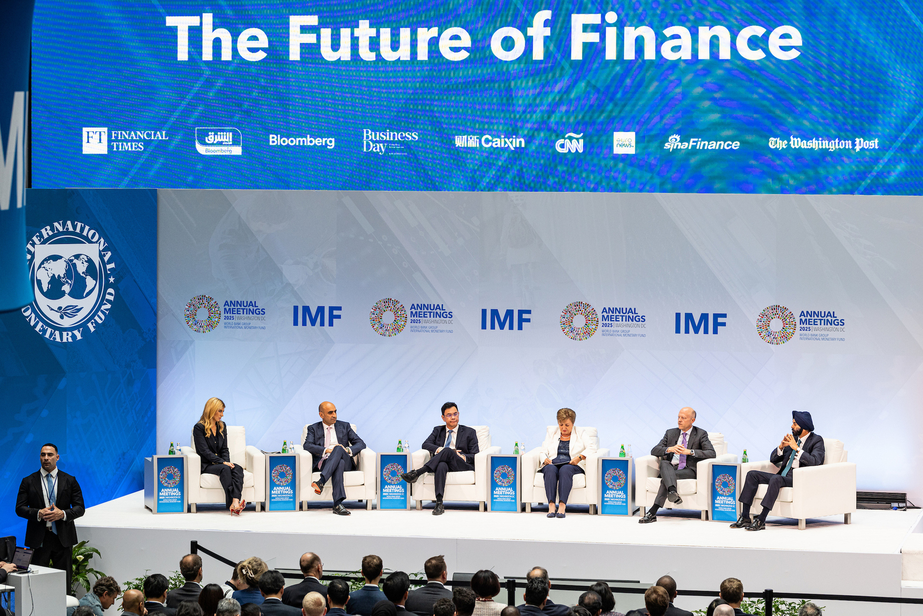 Managing Director Kristalina Georgieva, moderator and CNBC host Sara Eisen, J.P. Morgan Co-Head of Global Payments Umar Farooq, Monetary Authority of Singapore Managing Director Chia Der Jiun, Circle CEO Jeremy Allaire, and World Bank Group President Ajay Banga discuss how changes in technology are affecting the financial landscape with at the seminar “The Future of Finance” during the 2025 Annual Meetings of the World Bank Group and International Monetary Fund in Washington, DC, on October 14, 2025. IMF Photo/Valerie Plesch