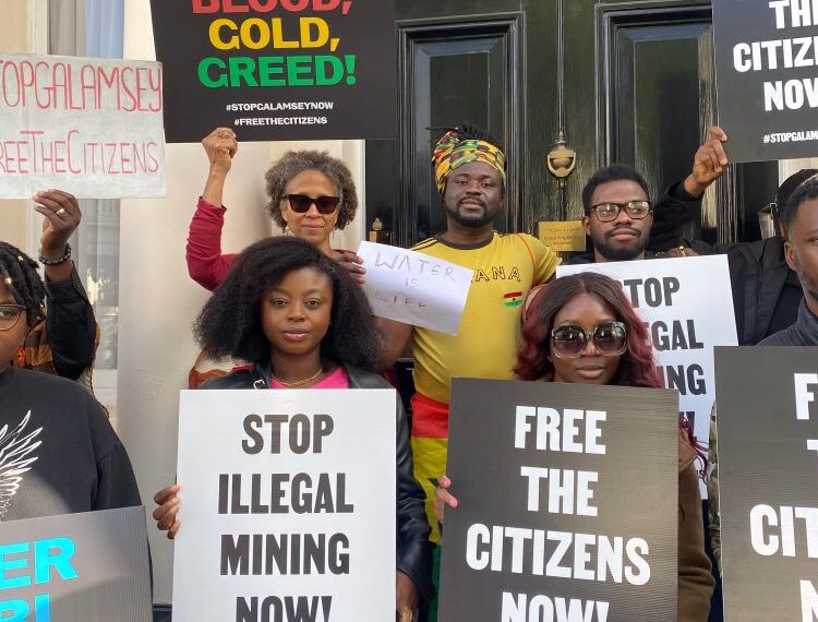 The demonstration, held in front of the Ghana High Commission in London, aimed to raise awareness about the devastating effects of illegal mining, known as “galamsey,” on Ghana’s environment and communities.