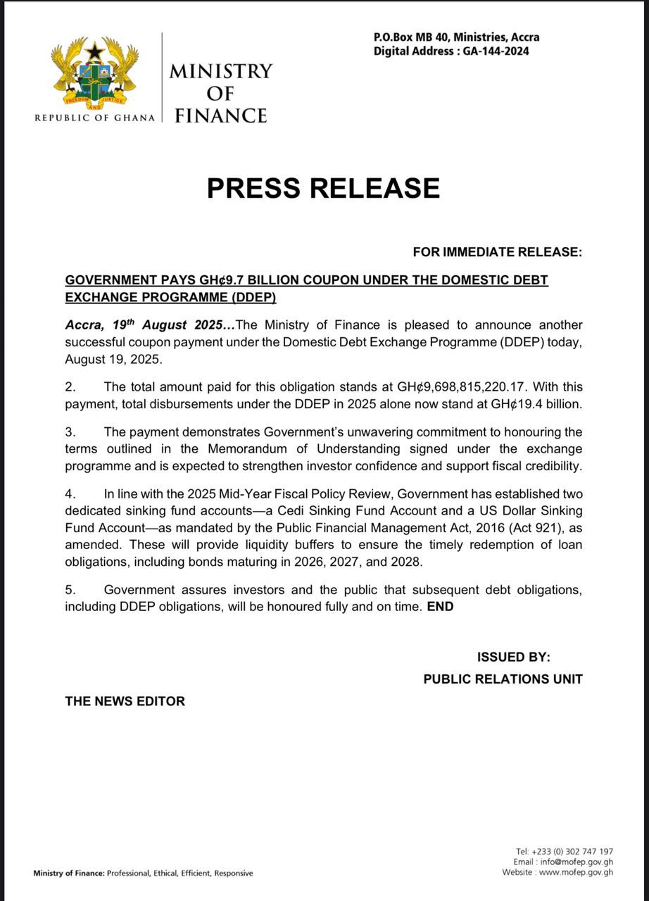 The Ministry of Finance has announced the successful disbursement of GHS 9.7 billion as coupon payments under the Domestic Debt Exchange Programme (DDEP).