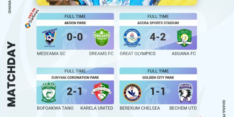 The result takes Accra Great Olympics to the 10th spot with 31 points – while Aduana FC drops further behind Nations FC and leaders FC Samartex 1996.