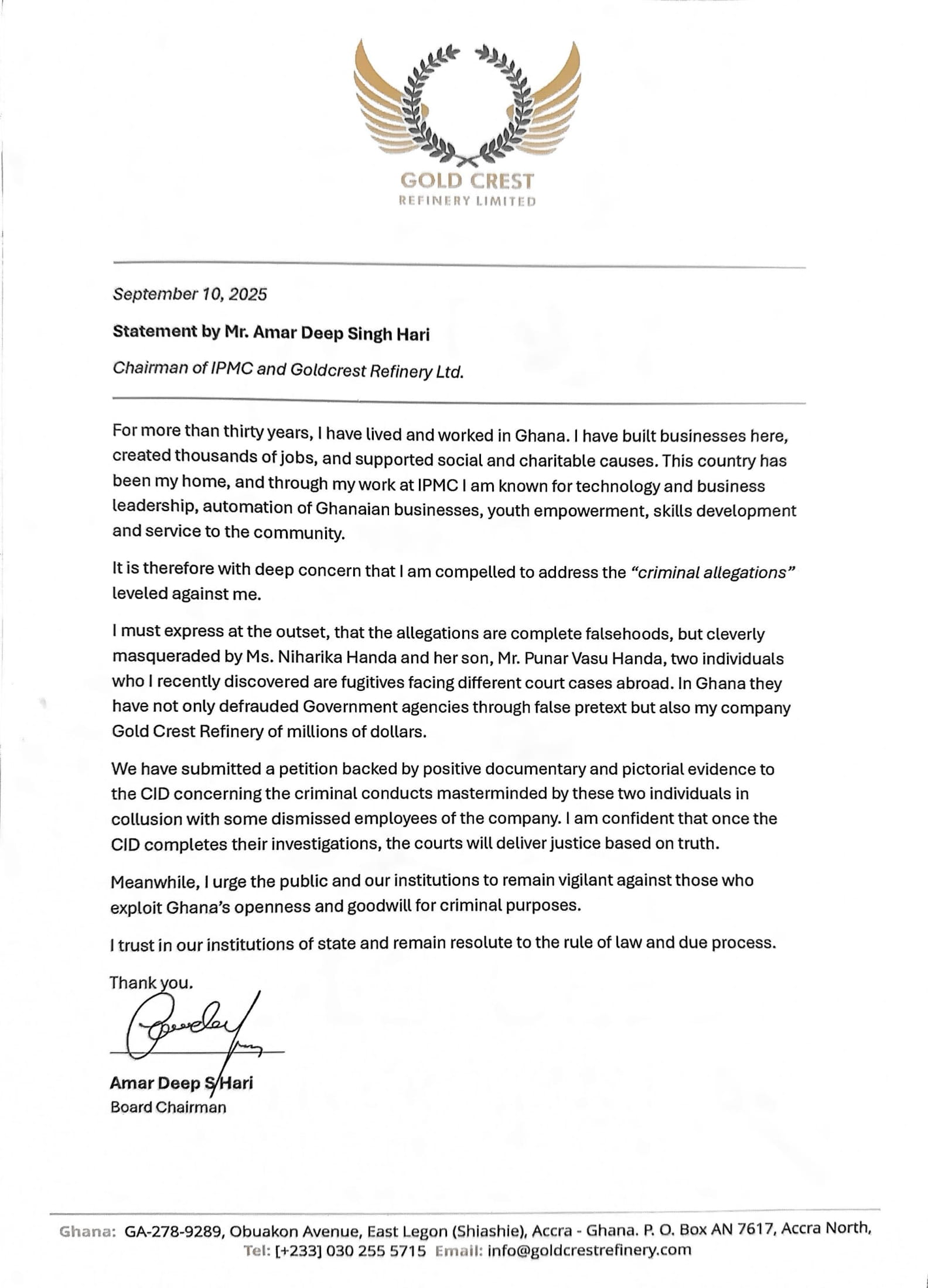 Chairman of IPMC and Goldcrest Refinery Ltd, Mr. Amar Deep Singh Hari, has dismissed as false the criminal allegations recently leveled against him, describing them as fabrications orchestrated by individuals he identified as fugitives.