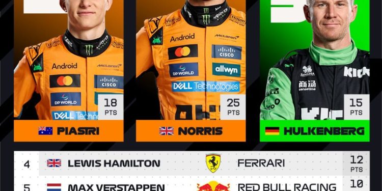 The race featured a mix of rain and dry conditions, leading to several strategic challenges. A mid-race Safety Car contributed to the drama, particularly when Verstappen spun at the restart, allowing Norris to take advantage. Piastri’s 10-second penalty for a Safety Car infringement further facilitated the McLaren duo’s positions, with Norris ultimately overtaking Piastri during the final pit stops.