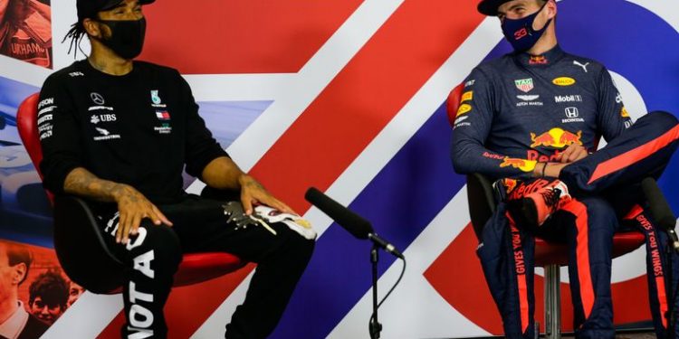 This time, they appeared to have equally good starts – although Verstappen quickly moved his Red Bull from the right of the track to the left to gain a slipstream from Hamilton’s pole-sitting Mercedes.