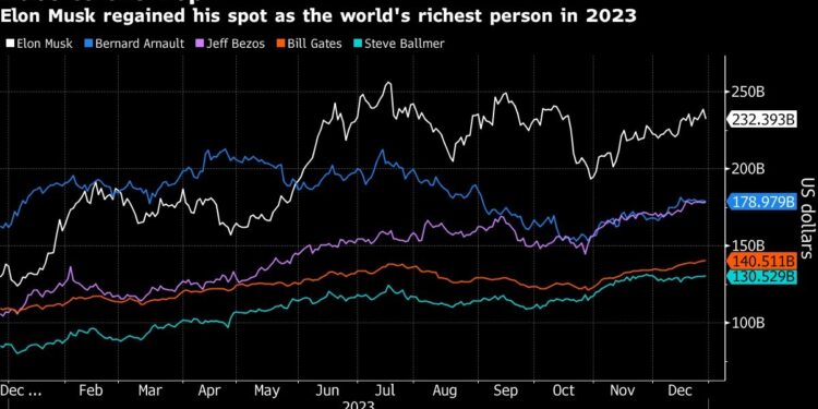 No one did better than Elon Musk, who recaptured the title of world’s richest person from French luxury tycoon Bernard Arnault. The Tesla Inc. chief executive officer netted an additional $95.4 billion through Thursday’s close, bolstered by the success of Tesla and SpaceX, after losing $138 billion in 2022. His net worth is now more than $50 billion above Arnault’s after a global slowdown in demand for luxury goods dented shares of LVMH Moet Hennessy Louis Vuitton SE.