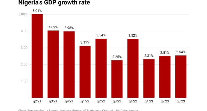 Africa’s biggest economy saw its Gross Domestic Product (GDP) grow by 2.54 percent (year-on-year) in real terms in Q3 2023, compared to 2.51 percent in Q2 and 2.25 percent in the same period last year, according to the National Bureau of Statistics (NBS).