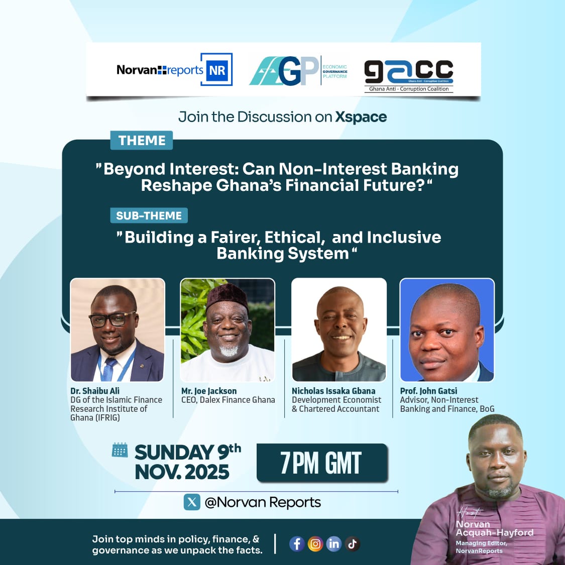 Against this backdrop, NorvanReports, in partnership with the Economic Governance Platform (EGP) and the Ghana Anti-Corruption Coalition (GACC), convenes its latest X Space Discussion on the theme “Beyond Interest: Can Non-Interest Banking Reshape Ghana’s Financial Future?” The session brings together policymakers, financial analysts, banking executives, and thought leaders to examine the opportunities and obstacles shaping Ghana’s transition toward a more inclusive financial architecture.