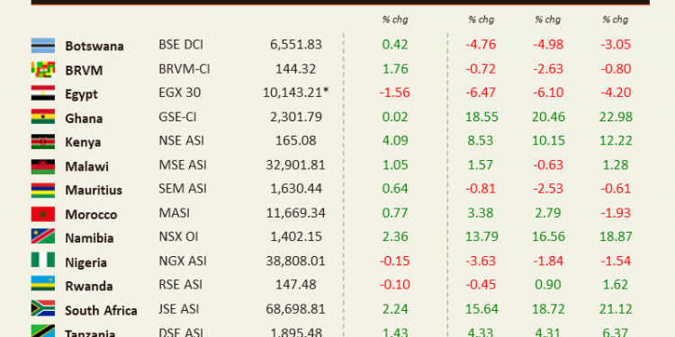 NSE – Kenyan equities rallied this week as the Nairobi Securities Exchange’s benchmark index jumped 4.09% WoW. The average daily turnover declined by 9% to KES 469m (USD 4.4m) and the total market capitalization amounts to KES 2,536bn (USD 23.59bn). The market is now up 8.53% YTD.