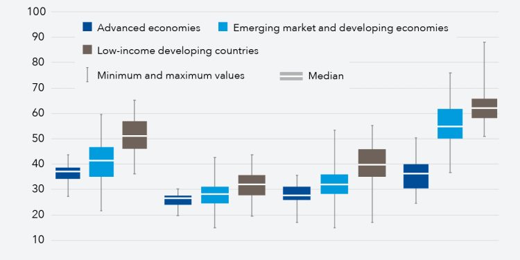 Spending reforms are challenging. Countries often establish minimum legal levels of funding for education, health, and social protection. Public salaries and pensions are also hard to change. Globally, about one-third of spending is effectively “locked in,” with advanced economies facing the highest rigidity.