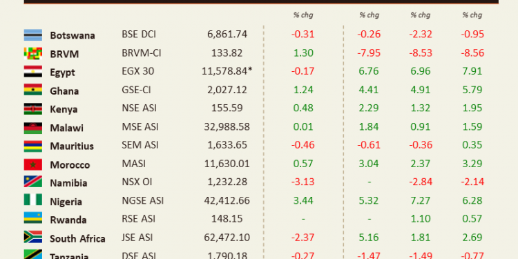 BRVM – Market participants on the BRVM halted the downward trajectory the regional market was on since the start of the year. The Composite Index gained 1.30% in a week that saw XOF 387m (USD 0.72m) worth of shares change hands every day on average. The market is down 7.95% year-to-date and the total market capitalization stands at XOF 4,020bn (USD 7.4bn).