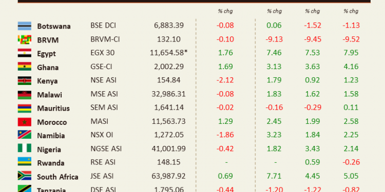 Overall sentiment on African equity markets was bearish with 10 of the markets we cover losing grounds, 1 remaining flat, and 5 advancing in local terms this week.