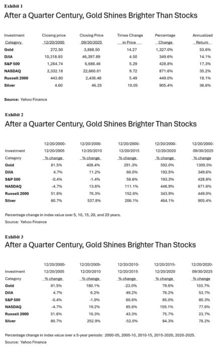 Gold has outperformed the four major U.S. stock indices from 2000 to the end of September 2025. It has also outperformed silver and U.S. GDP in terms of economic growth and has dramatically outpaced inflation, proving once again that gold as a safe-haven investment continues to stand the test of time.