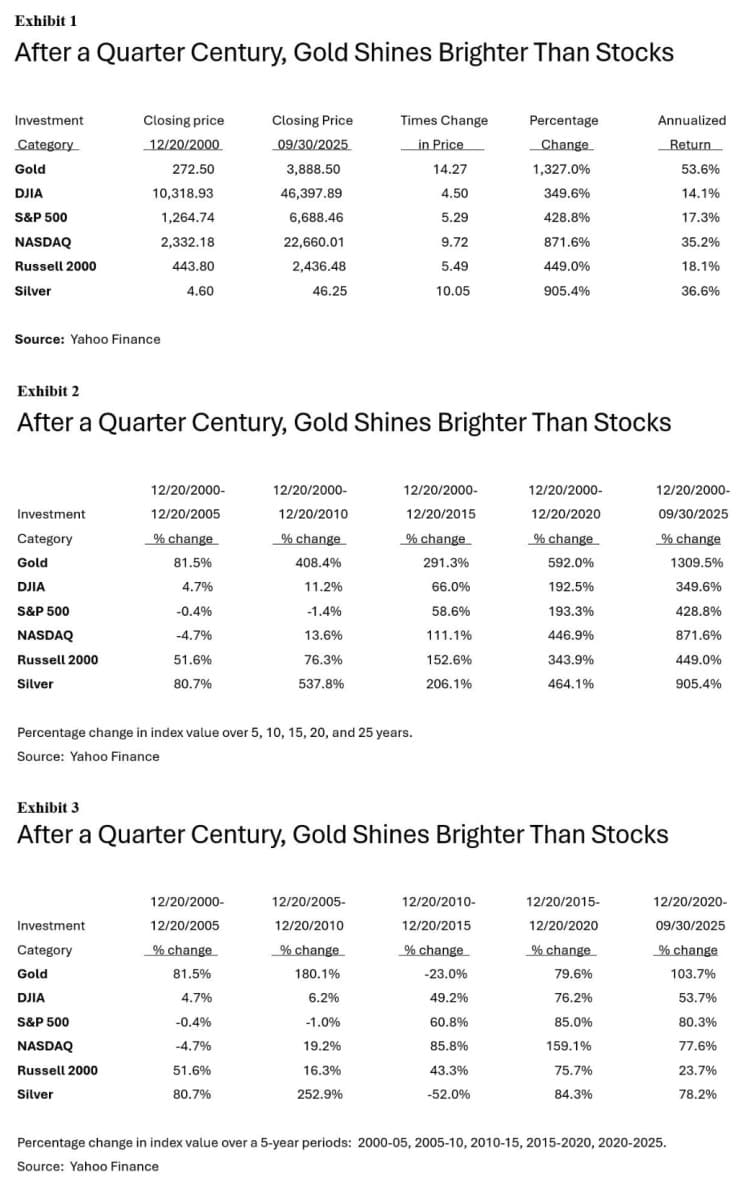 Gold has outperformed the four major U.S. stock indices from 2000 to the end of September 2025. It has also outperformed silver and U.S. GDP in terms of economic growth and has dramatically outpaced inflation, proving once again that gold as a safe-haven investment continues to stand the test of time.